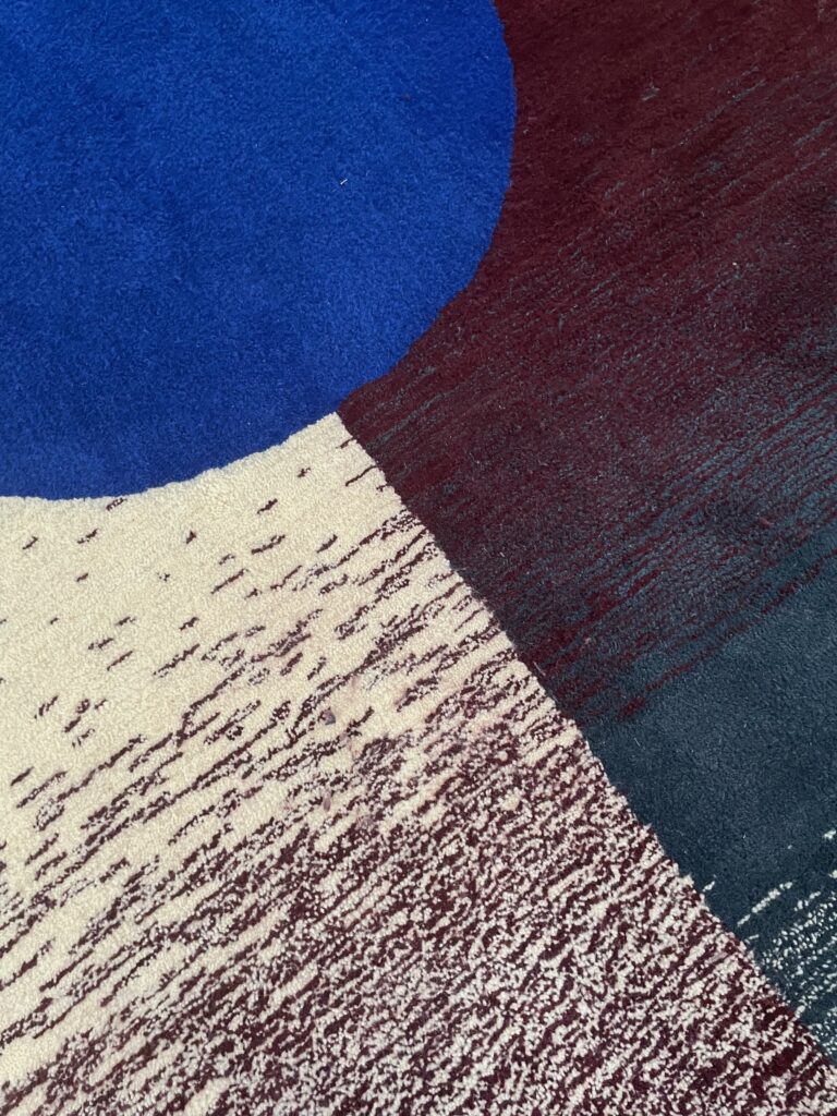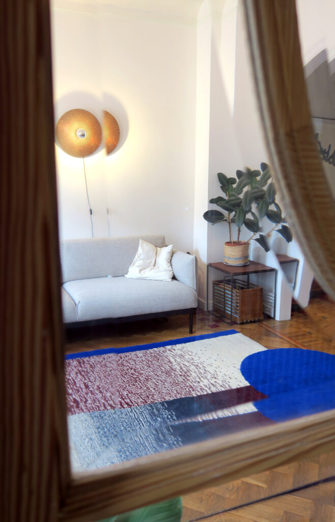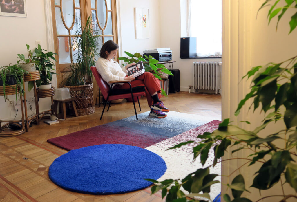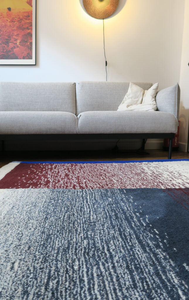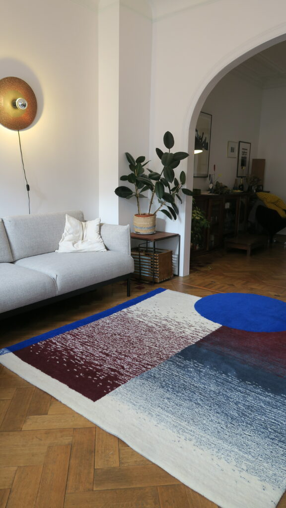 Blue Moon is a rug commissioned by Apolline Vranken and Thomas Kawam for their home. We conceived this project in close collaboration with them, drawing inspiration from their Art Nouveau interior, adorned with beautiful natural wood door frames. We executed a gradient work in inverted symmetry, adding a touch of color. The blue stands out and defines the rug with a bold circle, breaking free from the conventional rectangular form. Additionally, a play of vertical and horizontal lines adds rhythm to the design.