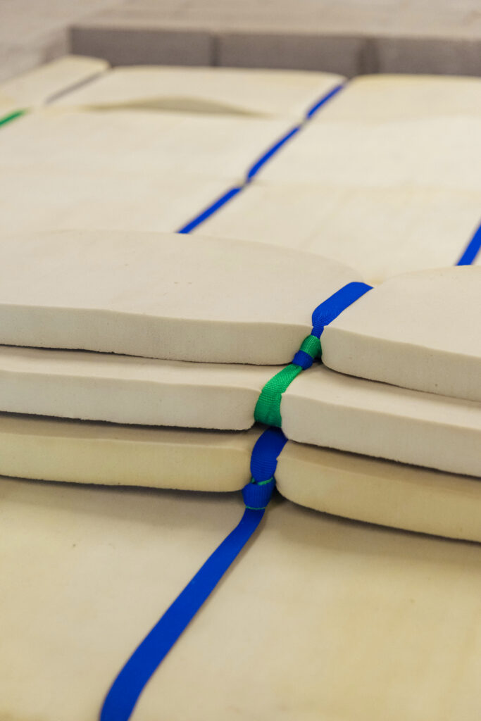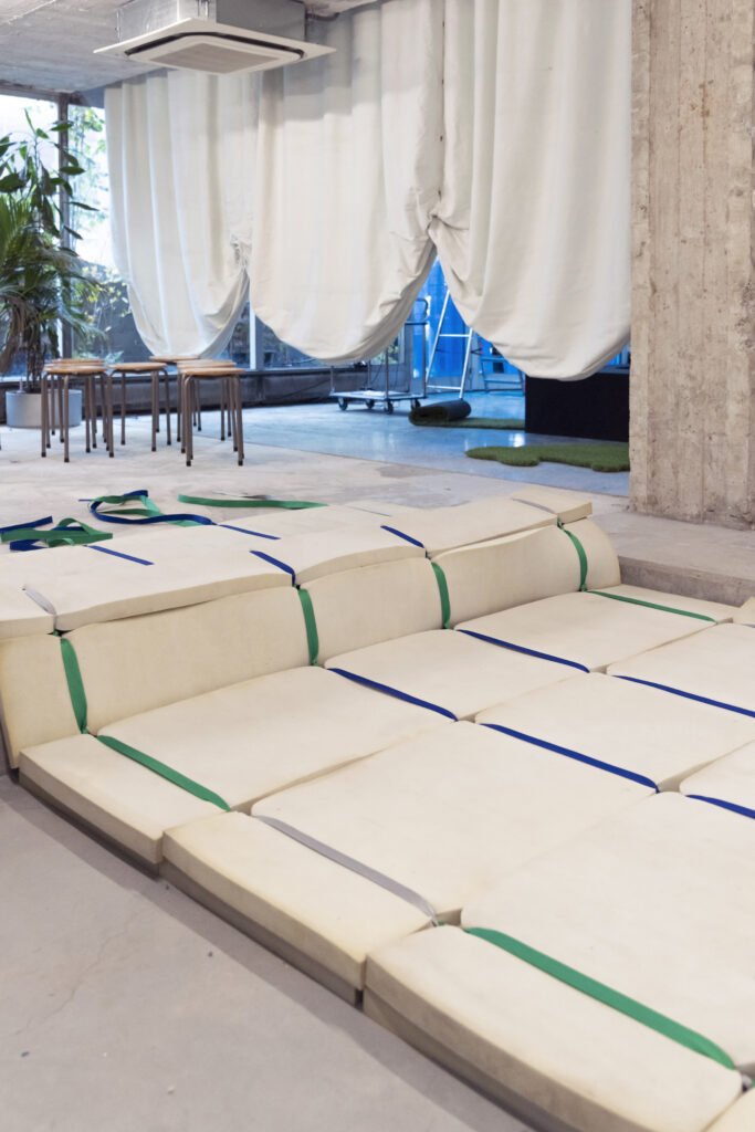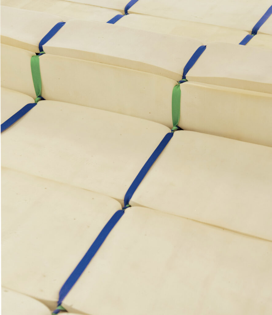 The TAPIMOUSSE asserts itself in its designated space: a large, foldable surface that can be customized to the user’s desires thanks to a system of colorful straps.