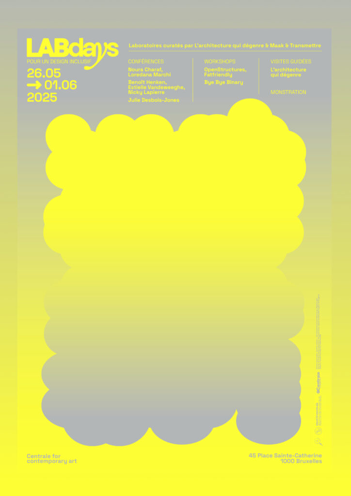 LABdays is an engaged curatorial project initiated by Maak & Transmettre asbl and L’architecture qui dégenre asbl, focusing on inclusive design, its history, and its future potential, with Centrale for contemporary art as its spatial core.