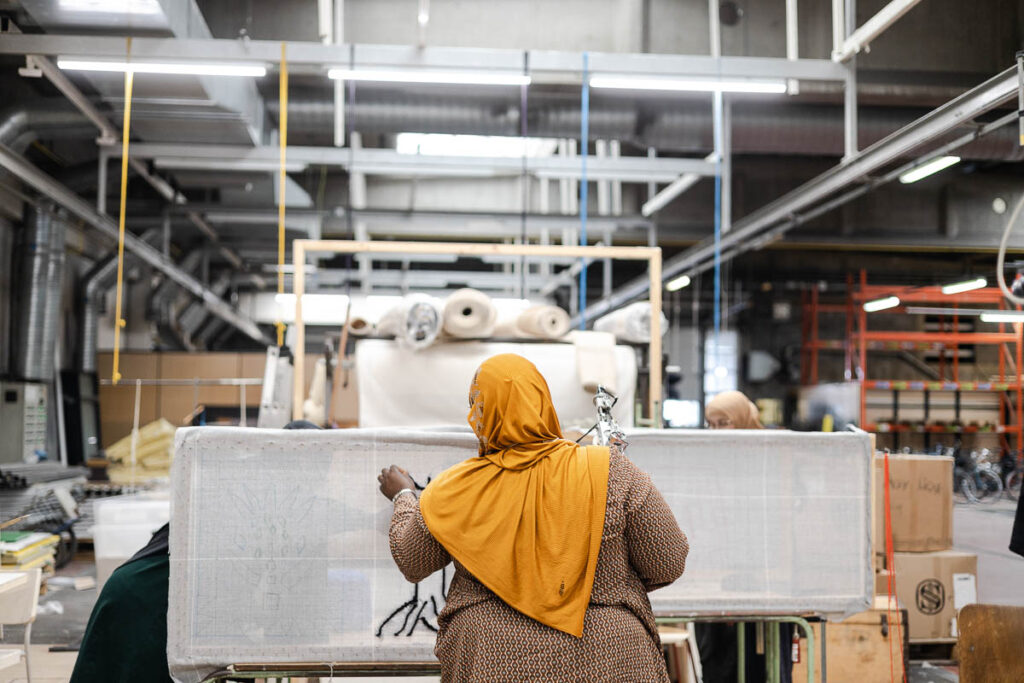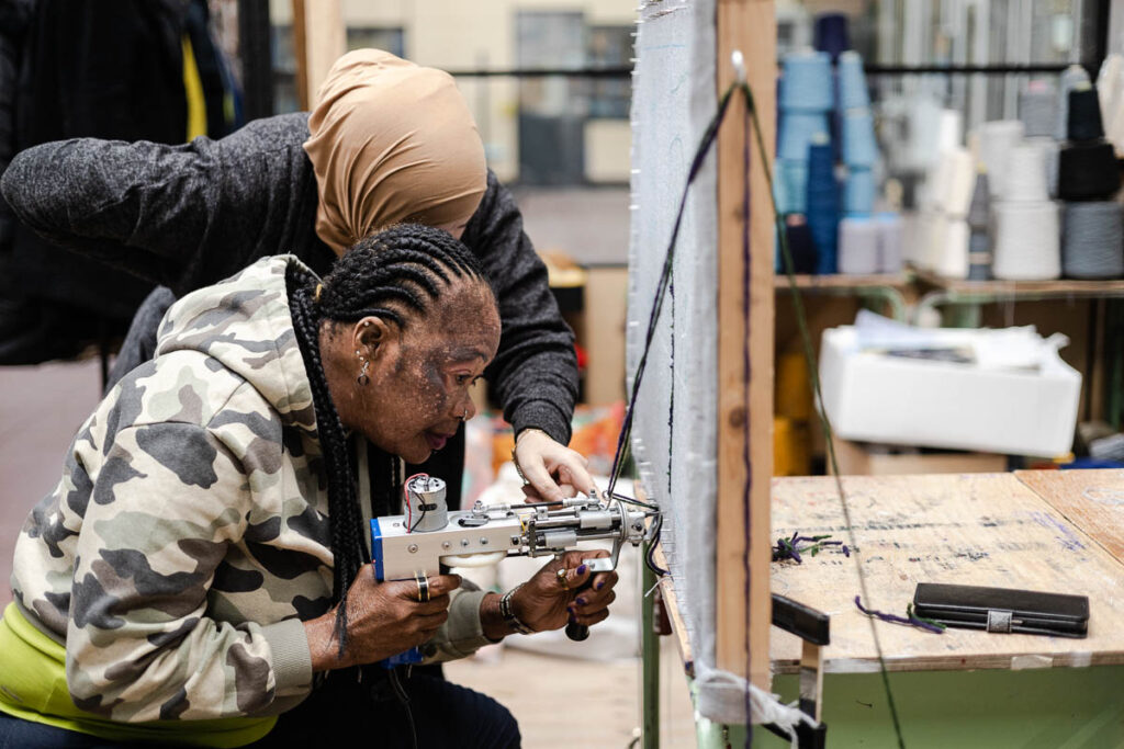 A new edition of “Tapis comme langage” has enabled the non-profit organization Maak & Transmettre to continue organizing workshops around the form of the carpet as a vehicle for dialogue. A group of 7 literacy learners from the Maison des Enfants in Anderlecht have been taking part over the past eight months. This new edition has been strengthened by the know-how of the previous year’s learners, thanks to the introduction of a mentoring system. Using the tuft technique, the aim is to enhance the value of doing without using words as the only means of communication. In particular, we worked on the representation of symbols. The project fostered a sense of trust and caring between the learners and the facilitators, allowing each of them to express their creativity. The result was a large collective carpet, a symbol of pride and empowerment for this group of women. With Fanta, Nénén, Rabia, Régine, Anifatou, Hafida, Mariam.