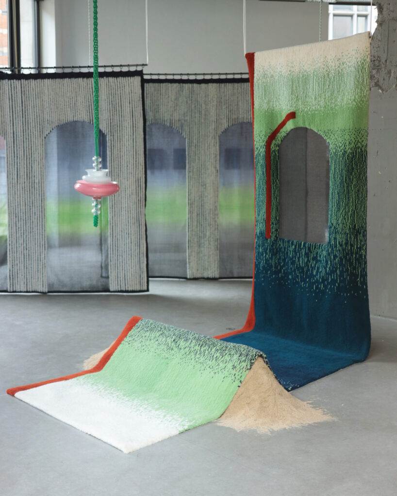 C’est le résultat d’une recherche faite à trois autour de l’idée d’un patio méditerranéen. Le point de départ est un poème évoquant le début d’une soirée d’été dans le sud de la France : ce moment fugace où les couleurs changent et où les ombres grandissent. Cela a donné naissance à une paroi tuftée qui se prolonge en tapis au sol. Celle-ci est percée d’une fenêtre laissant songeuse la personne qui regarde au travers. Maak & Transmettre invite le spectateur à éprouver cette pièce en se baladant autour, en jouant avec la transparence de la fenêtre ou en venant se prélasser dessus. Le résultat est scénographique, presque théâtral, à la limite entre une œuvre et un objet de design.