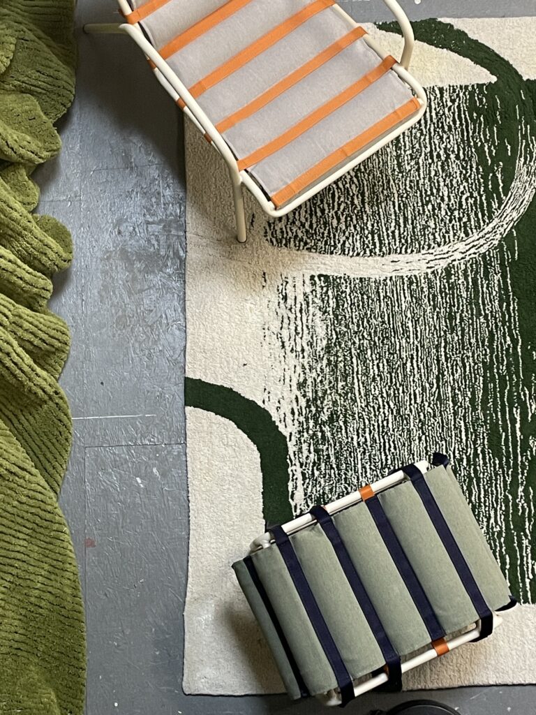 Ce tapis dévoile un travail sur le passage d’une couleur à une autre via la technique inspirée du marbré. C’est la première création de M&T qui est basée sur la notion de dégradé. Par un jeu de pleins et de vides entre formes nettes et floues, la composition du tapis a été pensée pour délimiter plusieurs zones. Cette production a été inspirée par l’aménagement intérieur d’un particulier, entre la végétation et la luminosité de l’appartement.